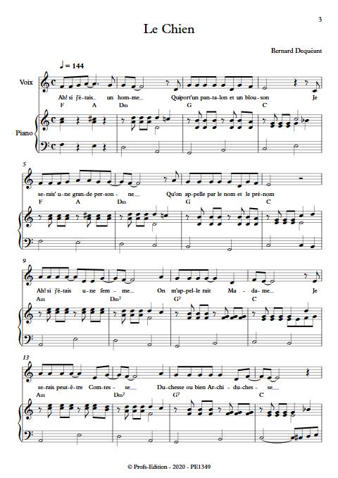 Le Chien est une chanson humoristique pouvant être interprétée par un ensemble d’enfants en école primaire ou en école de musique avec accompagnement de piano ou un simple accompagnement de guitare, les accords étant notés. L’accompagnement de piano pourra être fait par un professeur ou un élève de fin de 2e cycle.