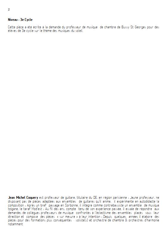 Cette pièce a été écrite à la demande du professeur de musique de chambre de Bussy St-Georges pour des élèves de 3e cycle sur le thème des musiques du soleil.