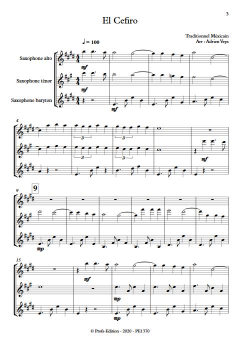 El Cefiro (le zéphyr) est une ballade mexicaine, arrangée ici sur un rythme de habanera assuré par la partie de saxophone baryton. Le thème étant distribué successivement à chaque partie, les interprètes veilleront à l’équilibre des nuances !